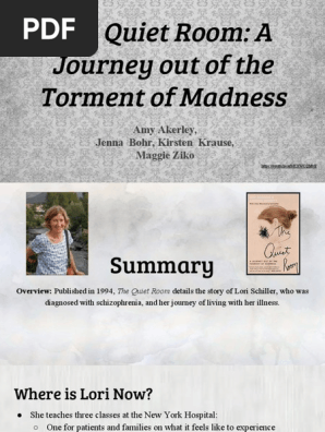 The quiet room lori schiller summary. The quiet room is the story of lori schiller a young jewish woman who suffers from schizophrenia and her attempts to cope with the disease. A journey out of the torment of madness grants its readers a fleeting vivid glimpse into the reality of living with a serious mental illness. Lori schiller s memoir the quiet room. This detailed literature summary also contains topics for discussion and a free quiz on the quiet room.